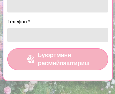 Дарахтсимон атиргул ниҳолларига буюртма бериш учун ариза қолдиринг — операторларимиз сиз билан тез орада боғланиб, расмийлаштиришда ёрдам беришади!