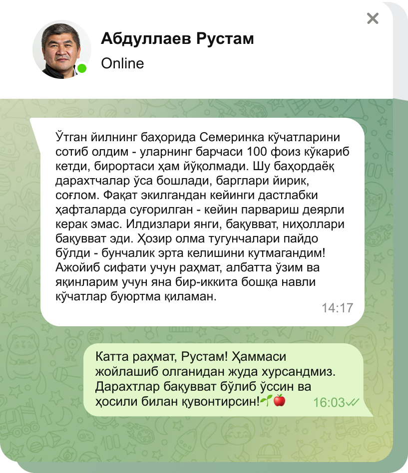 Харидорларимизнинг мўл ҳосили - кўчатларимизнинг энг яхши рекламаси